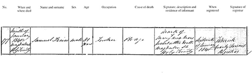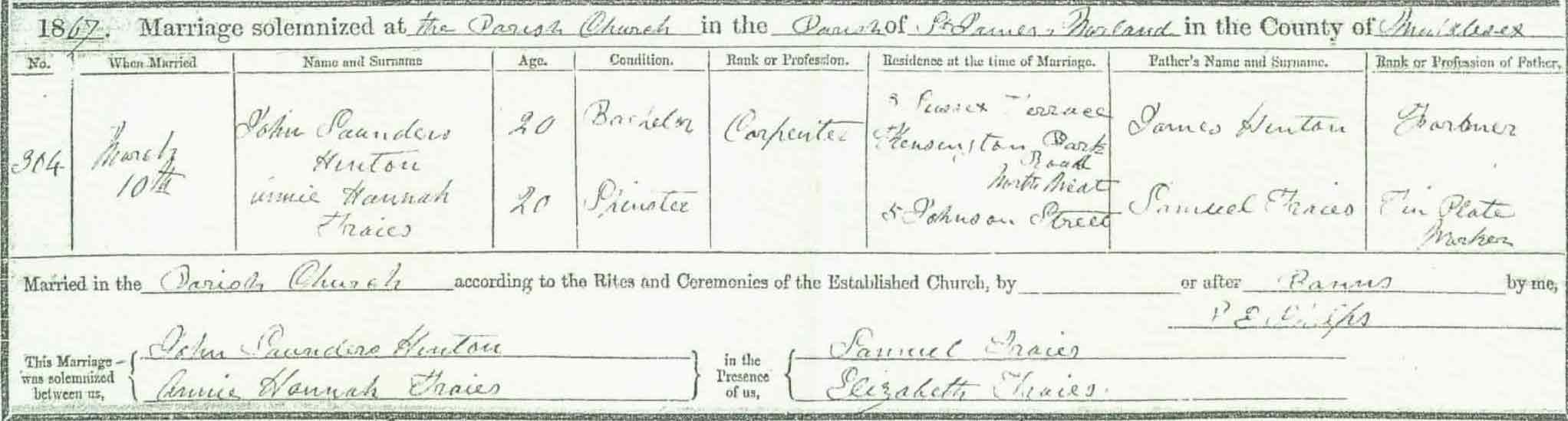 SAMUEL TRAIES and ELIZABETH nee MICHEL Samuel TRAIES 1810 b. 24May1810 ) St Mary - St Marylebone Road, Marylebone, Middlesex, daur of James Traies and Hannah (IGI C035245) 1813 c. 12Feb1813 ) 1830 m. 31May1830 Christchurch, Cosway St., St Marylebone p18 parish register mf LMA Samuel TRAIES of the District/Rectory of Christchurch Marylebone bachelor and Elizabeth ROBERTS of the District/Rectory of Christchurch Marylebone widow were married in this church by me W.J. Hutchins curate both sign their names in presence of John Foxton, Stephen Tevene(?) Roberts 1841 Census Samuel Traies, aged 37, b. Middlesex, England, Tin Plate Worker, St Leonard Shoreditch , Middlesex. 1851 Census Samuel Praies, Head, mar,age 40, Tinplate worker, b. Middlesex, living @ 1 Ray St., Clerkenwell 1861 Census living in Pickard Street, Finsbury (RG9 201 60 64) 1871 Census living at 5 Johnson Street, Chelsea (transcribed as Travies) (RG10 33 111 19) 1881 Census Samuel FRAIES, aged 70, b. Marylebone, Middlesex, Head, 53 Bridport Place, Shoreditch, London, Gas Meter Maker. [According to Margaret xxxxx an old letter describes him as Brazier in Islington. Later lived at 5 Johnson Street Notting Hill where established as Tin Plate Worker and Brazier since 1835 not far from father James. A letter dated 1878 mentions ‘being turned out of their old house after a residence in it of 40 years and the sacrifice of an established business.] 1890 d. Samuel TRAISS age 79 (Shoreditch RD Jan=Feb-Mar 1890 1c 125 Registration District Shoreditch 1890 Death in the Sub-district of Haggerston in the County of Middlesex. No. 130) When and Where died: Twentieth January 1890, Shoreditch Infirmary Name and Surname: Samuel Traies Sex: Male Age: 79 Years Occupation: formerly a Gas meter maker, of Shoreditch Workhouse Cause of Death: Gout Bronchitis. Certified by D.M.Forbes L.R.C.P. Signature, description and residence of informant: D.M.Forbes Medical Superintendent, Shoreditch Infirmary, Hoxton Street, Haggerston When Registered: Twenty third January 1890. Signature of Registrar: A A Lough Newman, Registrar sp- Elizabeth (Betsey) ROBERTS nee MICHEL 1804 b. 3Jan1804 ) St Leonards Shoredith Elizabeth daur Louis and Elizabeth Michel (IGI C040802) 1804 c. 1Feb1804 ) [Also known as 'Betsey'.] 1822 m. 27Aug1822 St. Mary, Newington, Surrey Elizabeth Mitchell and John Roberts (IGI M055631) Caroline Elizabeth ROBERTS 1824 b. 04Aug1823 c. 28Sep1823 St Mary Newington Surrey. Caroline Elizabeth, daughter of John and Elizabeth Roberts, Weymouth Street, Whipmaker (LMA via Ancestry & IGI C055632) Henry Stephen ROBERTS 1826 b. 11Mar1826 c. 02Jul1826 St Mary Newington Surrey. Henry Stephen son of John and Elizabeth Roberts, Weymouth Street, Whipmaker (LMA via Ancestry & IGI C055632) 1873 Betsey wrote in 1873 "son Henry was for 18 years in the Publicity line, now retired and living in Jersey." Elizabeth Caroline ROBERTS 1828 b. 29Oct1828 c. 21Dec1828 St Mary Newington Surrey. Elizabeth Caroline Roberts, daughter of John and Elizabeth Roberts, East Lane, Whipmaker ((LMA via Ancestry & IGI C055632) 1841 Census. Living with mother and husband - see below 1841 Census Eliza Traies, age 37, b. Middlesex, England, St Leonard Shoreditch , Middlesex. [living with her and Samuel in 1841 was Ella Roberts, 12, not born in County of Middlesex, presumably a daughter of her marriage to John Roberts] 1851 Census Elizabeth, wife,age 47,b.Shoreditch 1881 Census Elizabeth FRAIES, age 76, b. Shoreditch, Middlesex, Wife, 53 Bridport Place, Shoreditch, London. 1884 d. Elizabeth TRAIES age 82 (Shoreditch RD Oct-Nov-Dec 1c 103) Registration District Shoreditch 1884 Death in the Sub-district of Haggerston in the County of Middlesex. No. 163 When and Where died: 13 November 1884, 70 Mansfield Street Name and Surname: Elizabeth Traies Sex: Female Age: 82 Years Occupation: Wife of Samuel Traies Gas meter maker Cause of Death: Bronchitis and shock consequent on a fall in her room while getting into bed Signature, description and residence of informant: Certificate received from John Humphreys, Coroner for Middlesex When Registered: Twentieth November 1884 Signature of Registrar: A A Lough Newman, Registrar Charles TRAIES 1851 census Charles Traies, Baker, b. Marylebone, living with parents 1851 m. 24Oct1851 Shoreditch, London. [Charles Traies, 1851, Oct-Nov-Dec, , Shoreditch , London, Middlesex.] LINK TO FURTHER INFORMATION Emma TRAIES 1841 Census Emma Traies, abt 1836 , Middlesex, England, St Leonard Shoreditch , Middlesex. 1859 m.1859 Islington Emma Traies and James Edwin Turner (Islington RD Oct-Nov-Dec 1859 1b 407) sp James Edwin TURNER 1837 b. son of James Turner and Eleanor Dunn who married 9Jul1826 St Dionis Backchurch London (IGI M001401) LINK TO FURTHER INFORMATION Jane TRAIES 1841 b. 11May1841 Shoreditch (extracted from birth certificate) 1841 Census Jane Traies, age 1 mo., b. Middlesex, England, St Leonard Shoreditch , Middlesex. 1865 m. Kensington Jane TRAIES and Samuel SANDERS (Kensington RD Jan-Feb-Mar 1865 vol 1a p76) 1871 Census at Rillington Place, Kensington Samuel Sanders, age 31, Carpenter born Uffenden?? Devon Jane Sanders, age 29 born Kingsland (RG10 48 34 60) 1881 Census 14 Rillington Place, Kensington Samuel Sanders, age 41, Carpenter born Devon Jane Sanders, age 39 born Kingsland (RG11 41 78 6) 1891 Census 14 Rillington Place, Kensington Samuel Sanders, 51, Carpenter, born Uffcolme, Devon Jane Sanders, 49, born Shoreditch (RG12 25 111 41) 1901 Census Clarenden Road. Kensington Jane and Samuel Sanders (LANDERS) (RG13 23 106 20) sp. Samuel SANDERS Nothing more known Hannah Caroline TRAIES 1847 b. 3Sep1847 Clerkenwell, Hannah Caroline (extracted from birth certificate) 1851 Census living with parents 1861 Census living with parents 1867 m. 10Mar1867 Church of St James marland?? Kensington, Annie Hannah TRAIES/TRAIKS and John Saunders HINTON (Kensington RD Jan-Feb-Mar 1867 1a 98) John Saunders HINTON 20 Bachelor, Carpenter, 5? Sussex Terrace, Kensington Bank Road, Nor