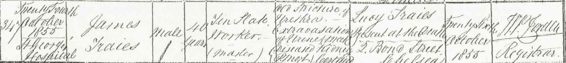 JAMES TRAIES (1785 - 1878) and his family In the St John's Hackney marriage register of 1818, James Traies is recorded as a bachelor. If correct, either Jane, Samuel, and Ann were the children of a different James Traies or James Traies had not married Hannah - possibly Hannah is the same person as Ann Sutton In addition to John Traies cordawainer of Soho, the following may be references to relatives. m. 11Apr1774 Kensington. John TREISE and Hannah GOLDER (FMP - submission by W Middx FHS) b. 12Jun1774 Traise My An d of Jm and Han, carpenter, Gravel Pits (baptismal register St Mary Abbotts, Kensington) w. 21Jun1810 Will of John Trais Liberty of the Rolls, Middlesex Date 21 June 1810 (PROB11/1512) w. 20Apr1820 Will of Henry William TRAIS, Gentleman of Pentonville , Middlesex Date 20 April 1820 (PROB 11/1628) This may indicate an earlier TRAIES family connection with the area. Visit also the following website for more information. James TRAIES 1785 c. 16Mar1785 St Mary Major, Exeter, Devon, son of Samuel Trays and Jane (IGI 051001) [Similar to next entry – probably baptism at home soon after birth as often occurred if child not expected to survive, followed by later baptism in church.] 1785 c. 29May1785 St Mary Major, Exeter, Devon, son of Samuel Traies and Jane (IGI 051001) 1803 'James Trays Tin Man' (1803 Exeter Militia List - Holy Trinity Parish) NOTE: Transcription on GENUKI omits the class but on Ancestry he appears to be Class 1 - age between 17 and 30 unmarried :- 'James Trays Tin Man 1--- '(1803 - Devon and Exeter Militia List - per Ancestry) Appears after 'Robert Gaul Tin Man Class 4' (age between 17 and 55) possibly an older man to whom he was apprenticed 1818 m. 8Oct1818 Jas Traies and Ann Sutton, Hackney see Register(St Johns Hackney Marriage Register) 1821 Census return for 37 Queen St. 1822 Traise, Jas, Tin Plate Worker and Brazier, 37 Queen St, Bryanston Square (Robson's New Directory for London: Commercial Directory, Street Guide and Carriers List. 4th Edition) 1822-33 Jas, James or J. Traies and always at 37 Queen St. Bryanston Square (Robson's, Pigot's and Kent's directories) 1823 J Traies, Tin Plate Worker (Pigot’s London and Provincial Commercial Directory, 1823/4) 1828 J Traies, 37 Queen Street, Bryanston Square (Pigot and Co's Metropolitan Directory 1828) Note:Queen St is present day Harrowby st - see old map ?1830 Newspaper report about watch stolen in pub. 1831 Census return for 37 Queen St. 1831 m. 8Mar1831 James Traies and Martha Looker, Hackney see Register(St Johns Hackney Marriage Register) 1833 J Traies, Tin Plate Worker, 37 Queen Street, Bryanston Square (Robson's London Directory 1833) 1839 James Traies, Tin Plater, Greyhound Row, Kensington Gravel Pits (Central Criminal Court, Witness, 11th Session 1839, p788) 1841 Census - all of Paddington, part of Kensington and a few other places are missing from the census - return possibly lost 1842 m. 13Nov1842 - St. John's Church, Paddington (Kensington RD Oct-Nov-Dec 3 254) James TRAIES, full age, widower, Tin Plate Worker, ?No. 16 Star St. father, Samuel TRAIES, gentleman and Jane BERRY, full age, spinster, Black Lion Lane, father, James BERRY, farmer Witnesses: Robert BIRD and Mary Ann NICHOLSON 1846 James Traies, Tin plate worker at ?10 Notting Hill High Street. (London Post Office Directory of 1846) 1851 census James Fraies, age 66, Exeter, Devon, England, Head , Kensington , Middlesex, Tin Plate Worker, 10 Notting Hill High Street, London 1851-54 James Traies, Tin Plate worker, 10 Notting Hill Gate, London (Kelly's Directories 1851 - 1854) 1856 James Traies sen., tinplate worker, 8 Uxbridge Street, Notting hill, Kensington (1856 Post Office Directory) 1857 m. 7Jun1857 - Parish Church, Paddington (Kensington RD Oct-Nov-Dec 3 254 James TRAIES, full age, widower, Tin Plate Worker, Moscow Road, father Samuel TRAIES, draper and Mary JONES, full age, spinster, Caroline Place, father Job JONES, farmer Witnesses: John COX and M A SOUTHERN 1861 Traies, James sen., tin plate worker, 3 Johnson St., Notting Hill, (1861 Commercial Directory) 1878 d. 18 Aug1878 (Kensington RD Jul-Aug-Sep 1a 81) James TRAIES age 94 at 55 Swinbrooke Road, Kensington Town, Kensington, Middlesex. Cause of death - Natural Decay. Present at death, H CHAPMAN oF same address sp1 - Hannah So far all we know about her is: - 1818 i. 08Mar1818 St Dunstan's Stepney Hannah Traies age 39 abode MEOT (aka Mile End Old Town?) (LMA Archives on line via Ancestry) sp2 - Ann SUTTON 1818 m. 08Oct1818 Jas Traies and Ann Sutton, Hackney 1830 i. 06Jan1830 St George, Hanover Square. Ann TRAYES of St. Marylebone. age 39 (FMP image) sp3- Martha LOOKER 1831 m. Jas TRAIES and Martha LOOKER St. John, Hackney (James widower and Martha LOOKER spinster) (Pallots Index) 1841 Census 1842 d. 2Sep1842 Martha Traies,48 years, wife of James Traies, tinplate worker in Kensington Informant James Traies present at death, Greyhound Row (Kensington RD Jul-Aug-Sep 3 222) Funeral at St Mary Abbotts, Kensington sp4- Jane BERRY 1791 c. 4Aug1792 Ash, Surrey, Jane daur of Jas Berry and Jane (Normandy under 2 miles away)IGI P014351 1842 m. James Traies and Jane Berry, Kensington (Kensington RD Oct-Nov-Dec 3 254) 1851 Census Jane Fraies, age 59, Normandy, Surrey, England, Wife, Kensington, Middlesex. 1856 d. Jane Traies (Kensington RD Apr-May-Jun) sp5- Mary JONES 1857 m. James Traies and Mary Jones, James's father given as Samuel, a draper(Kensington RD Apr-May-Jun 3 254) 1861 d. Mary Traies (Kensington RD Oct-Nov-Dec 1a 140) Jane TRAIES 1809 b. 30Apr1809 ) Old Church, St Pancras,London, Jane daur of James Traies and Hannah (IGI C047938) 1809 c. 7May1809 ) 1810 i. 23Feb1810 Whitefields Memorial Church at Camden and of St Pancras (Ancestry Non Conformist Records) Samuel TRAIES 1810 b. 24May1810 ) St Mary - St Marylebone Road, Marylebone, Middlesex, son of James Traies and Hannah, Abode: St marylebone, Trade/Occ: Trade(IGI C035245, LMA X23/017) 1813 c. 12Feb1813 ) 1890 d. 1890 Shoreditch Sour